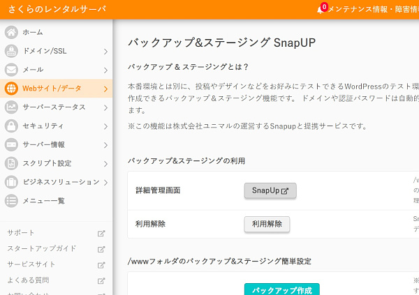 さくらのレンタルサーバコントロールパネルの「Webサイト/データ」→「バックアップ」→「詳細管理画面SnapUp」