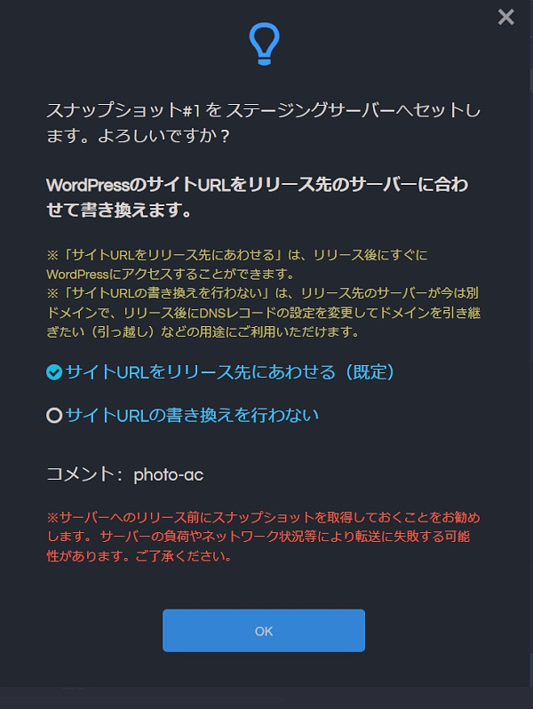 次にテスト環境の空のステージングサーバーを作り、その空のサーバーにスナップショット(サイトのコピー)をセットして本番環境と同じサイトのテスト環境が出来上がるという手順です。具体的には次の画面で進めていきます。